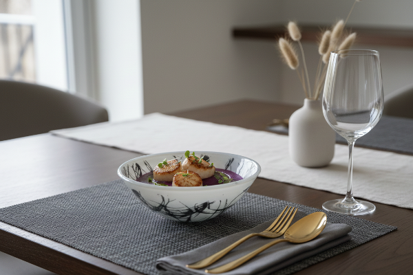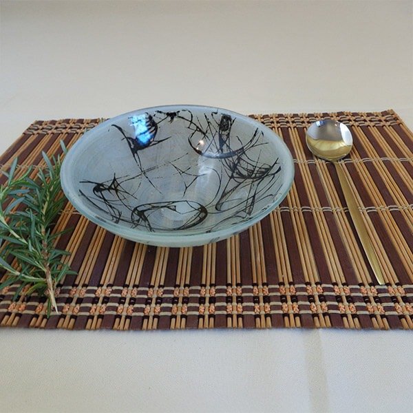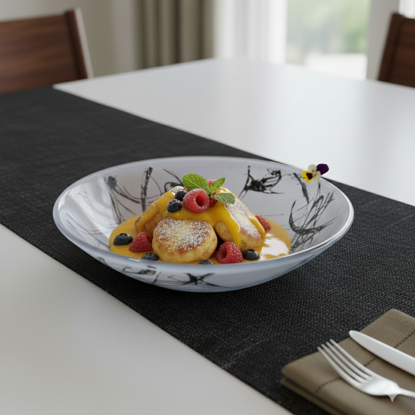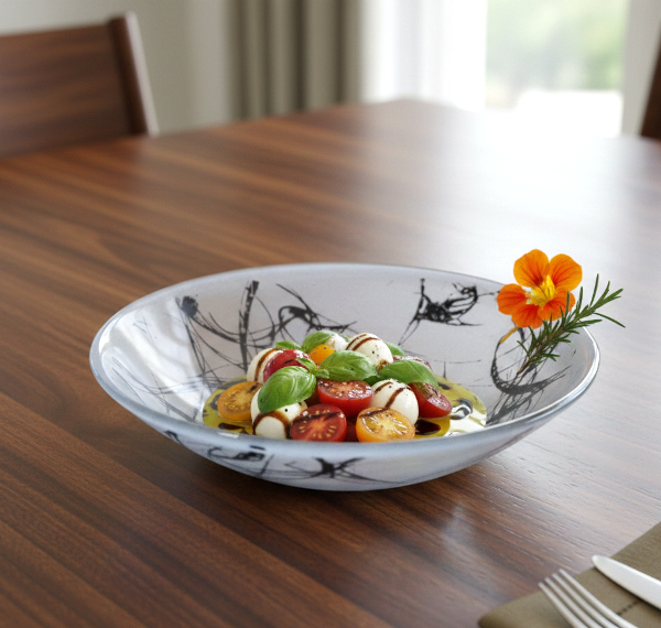 Diseño: Bowl de vidrio con un diseño minimalista de manchas abstractas en color negro. Su estilo artístico es versátil, ideal para la presentación de comidas dulces y saladas (sopas, postres, aperitivos).