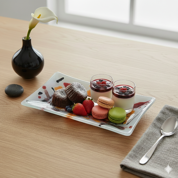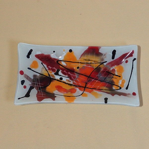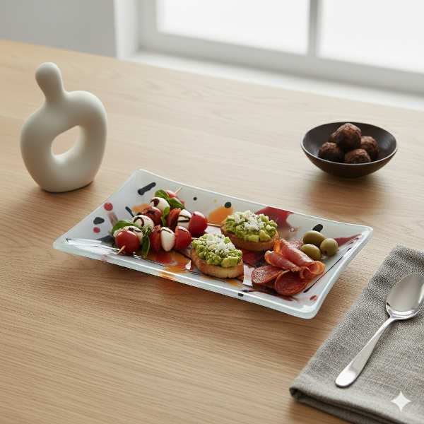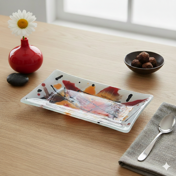 Diseño: Bandeja de vidrio rectangular, con bordes ligeramente curvados, que presenta una decoración abstracta y expresiva. El diseño utiliza salpicaduras y trazos artísticos en colores vibrantes (rojo, naranja, negro), lo que le confiere un estilo moderno e impactante. Es ideal para servir aperitivos, sushi o postres, siendo apta para comidas dulces y saladas.